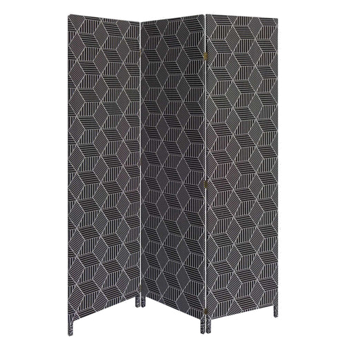 This 3 panel room divider is great for sectioning off any space in any room and serves as a beautiful accent. Constructed from solid wood panels with a soft fabric finish. The soft fabric features a black and white geometric pattern that creates an attractive contemporary design. This room divider is an excellent item to have in your home or any place, it is transitional, very light-weight, and easy to store. Finished on both sides.