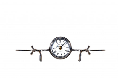 This unique aeroplane clock comes with the clock in the center of the wings. It features 100% hand-cast in solid aluminum and topped with a nickel-plated finish. The clock run with one AA battery (not included) and has a white face finish with Roman numerals numbers for a vintage look. Every detail on the model is hand polished to a high luster. This aeroplane clock is a perfect addition to any aviation enthusiast home or office!