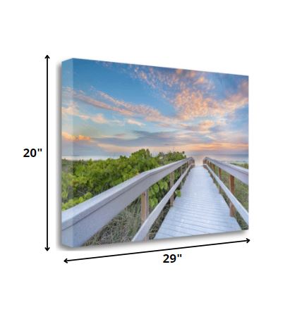 Vibrant and coastal, this Picturesque Sunset Beach View Giclee Wrap Canvas Wall Art is a high quality way to bring color and beachy tropical fashion into your space. This modern coastal image of a walkway leading to a beautiful sunset on the beach is printed and wrapped over the edges using high end giclee techniques that is stretched over a sturdy wood square frame. The result is a beautiful piece of art that will look great in most any room. 20" x 29" x 1.5".
