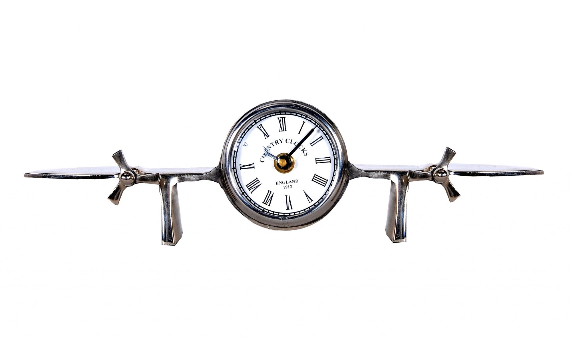 This unique aeroplane clock comes with the clock in the center of the wings. It features 100% hand-cast in solid aluminum and topped with a nickel-plated finish. The clock run with one AA battery (not included) and has a white face finish with Roman numerals numbers for a vintage look. Every detail on the model is hand polished to a high luster. This aeroplane clock is a perfect addition to any aviation enthusiast home or office!
